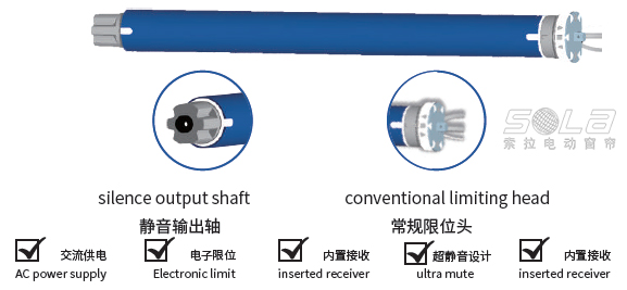 SOLA超靜音管狀電機是卷簾裝飾靚化、遮陽、隔熱降噪調(diào)節(jié)等系統(tǒng)控制最完善的解決方案,多種不同規(guī)格的管狀